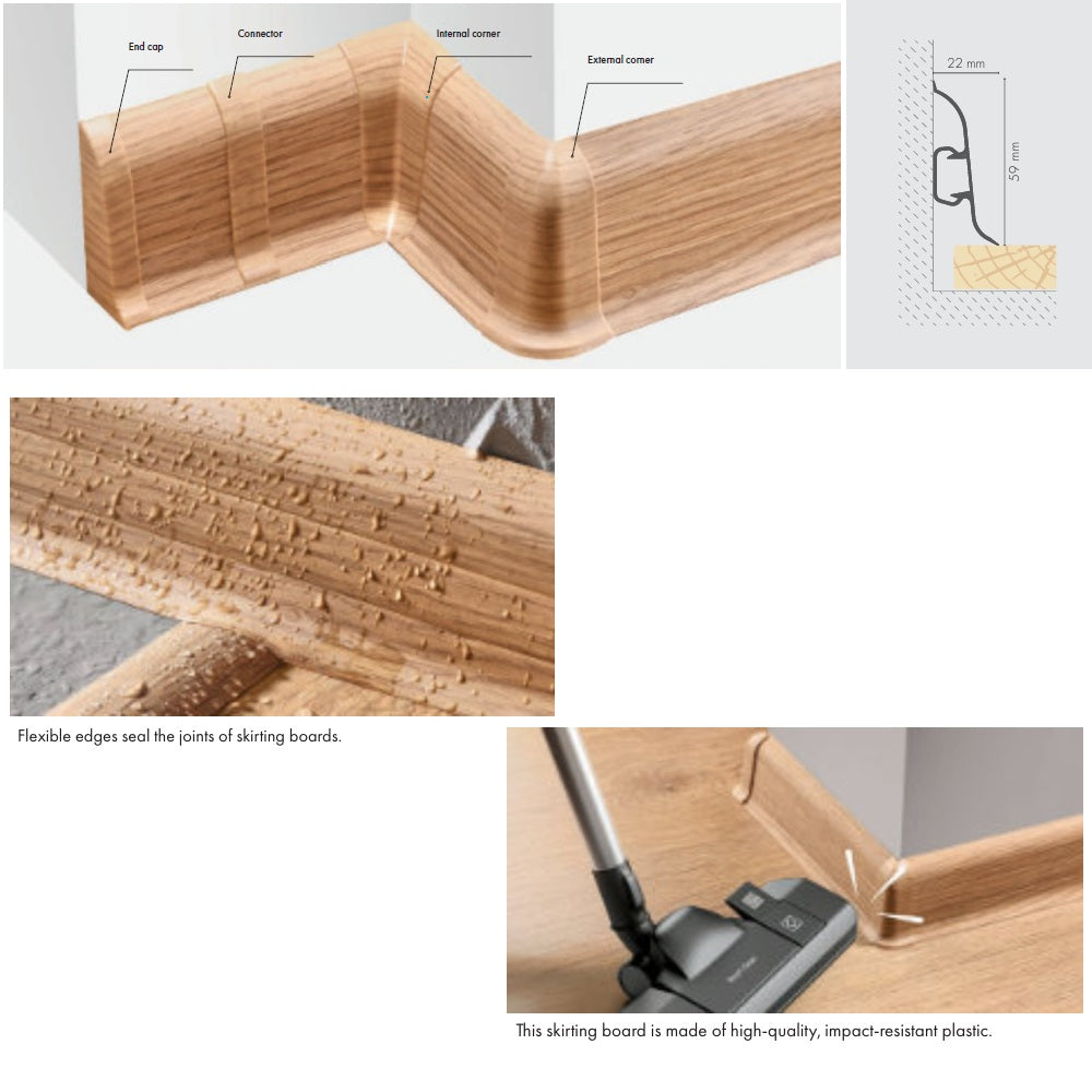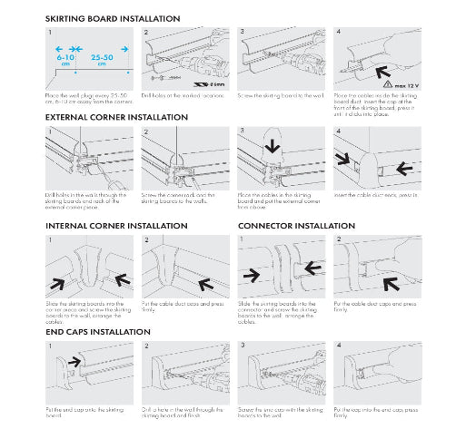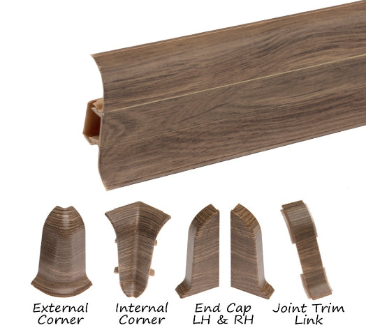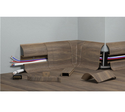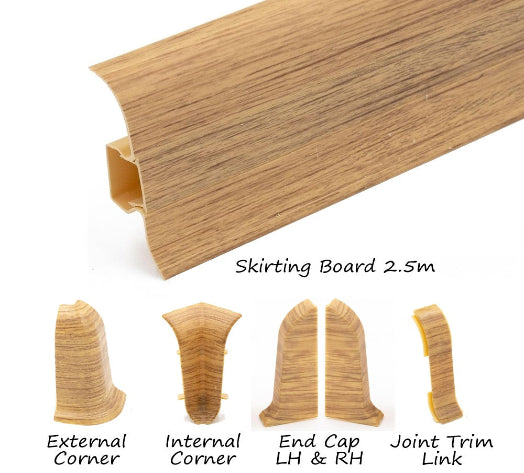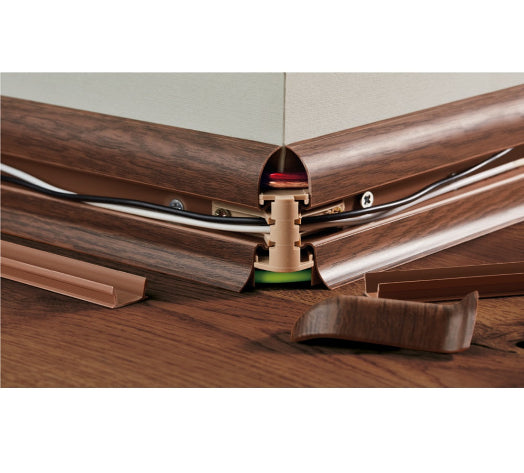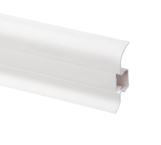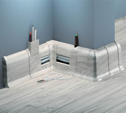 The unique centre strip design also allows for wires to be run behind the skirting and effectively hidden once the centre strip has been fitted back in place. The skirting board is supplied in 2.2m long lengths in various colours, with each of the accessories supplied as single units.